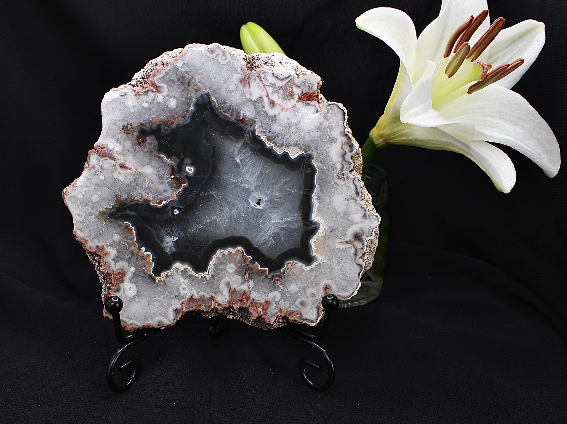 Achat ist ein Chalcedon und gehört damit zu den mikrokristallinen Quarzen. Durch wechselnde chemische Bedingungen und Verunreinigungen entstehen schichtweise die bunten Bänder.