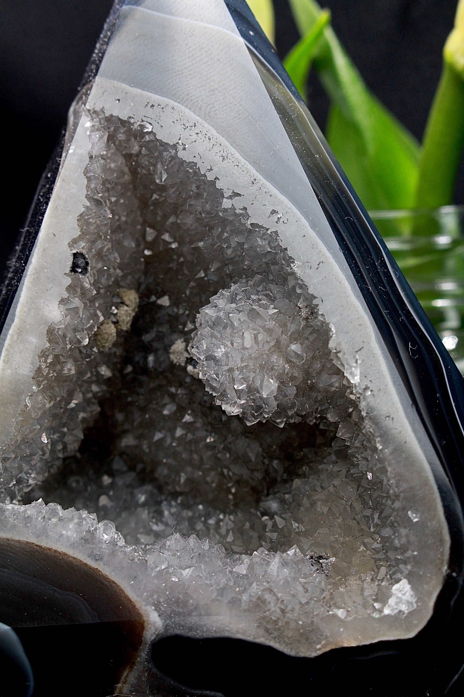 Wenn der Hohlraum nicht komplett aufgefüllt wird, bleibt in der Mitte Platz. In diesem offenen Rest wachsen Kristalle, meist Quarz, Amethyst, Calcit oder andere Mineralien, in den Hohlraum hinein.