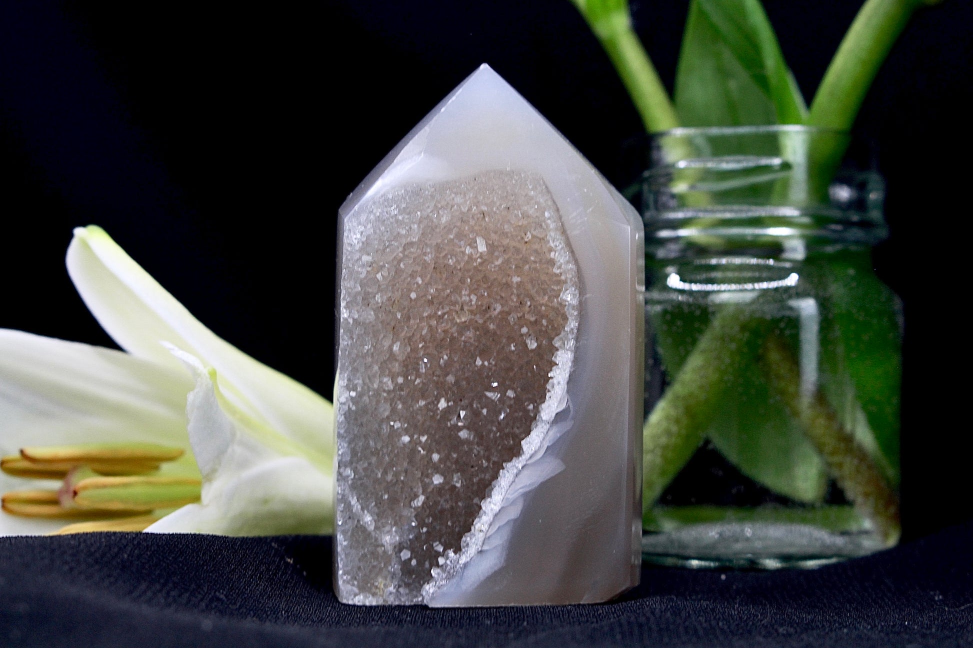 Wenn der Hohlraum nicht komplett aufgefüllt wird, bleibt in der Mitte Platz. In diesem offenen Rest wachsen Kristalle, meist Quarz, Amethyst, Calcit oder andere Mineralien, in den Hohlraum hinein.