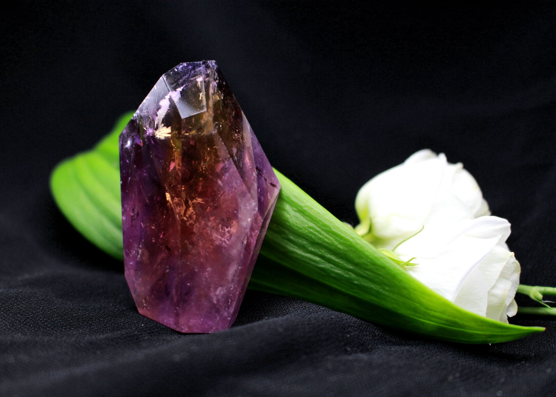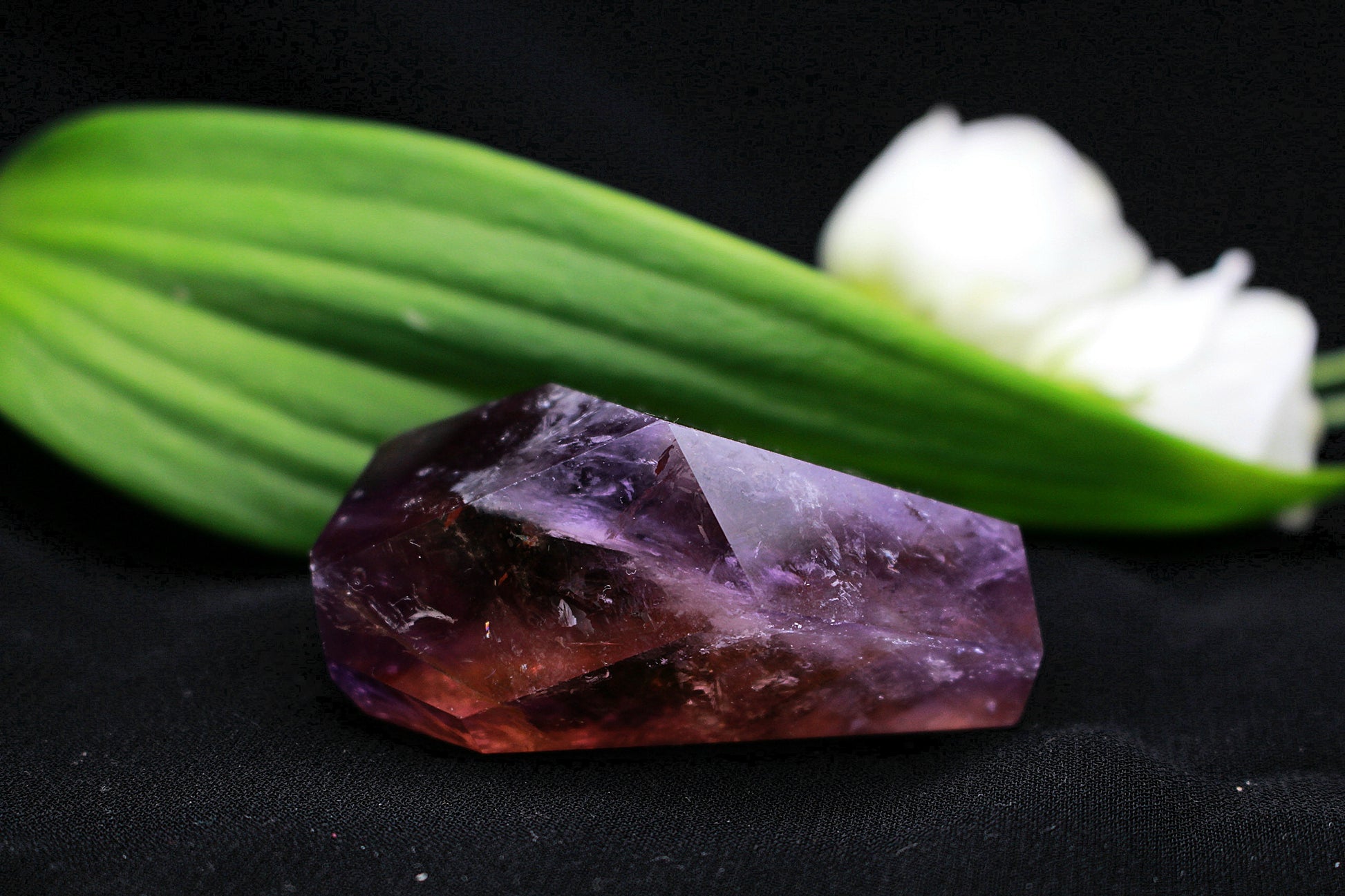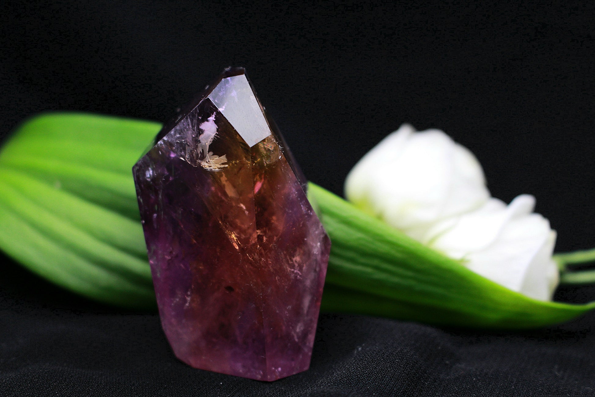 Ametrin ist eine natürliche Fusion von Amethyst und Citrin. Temperaturunterschiede beeinflussen die Oxidationsstufe und Anordnung der Eisenionen. Nur wenn während der Kristallbildung Temperaturunterschiede im Kristall auftreten, entstehen beide Farben gleichzeitig.