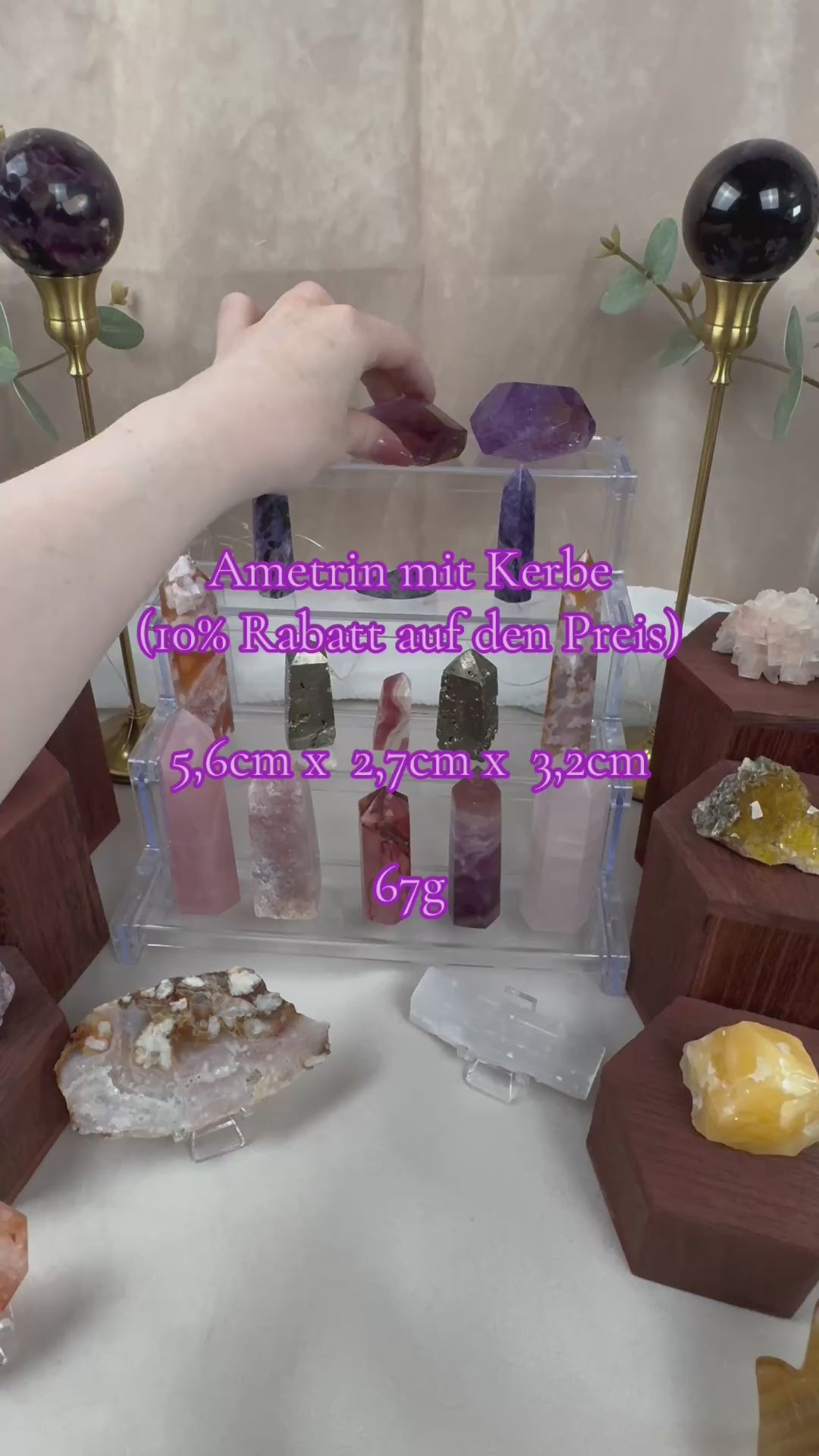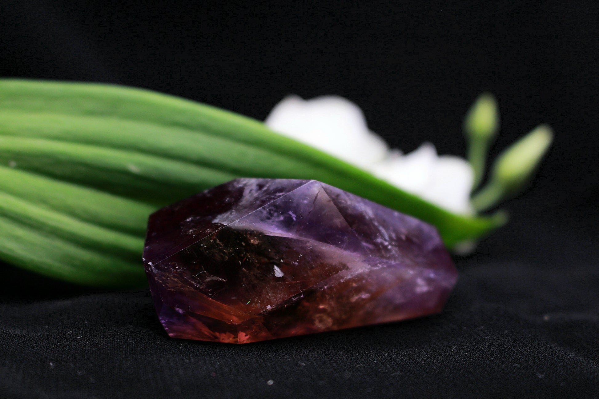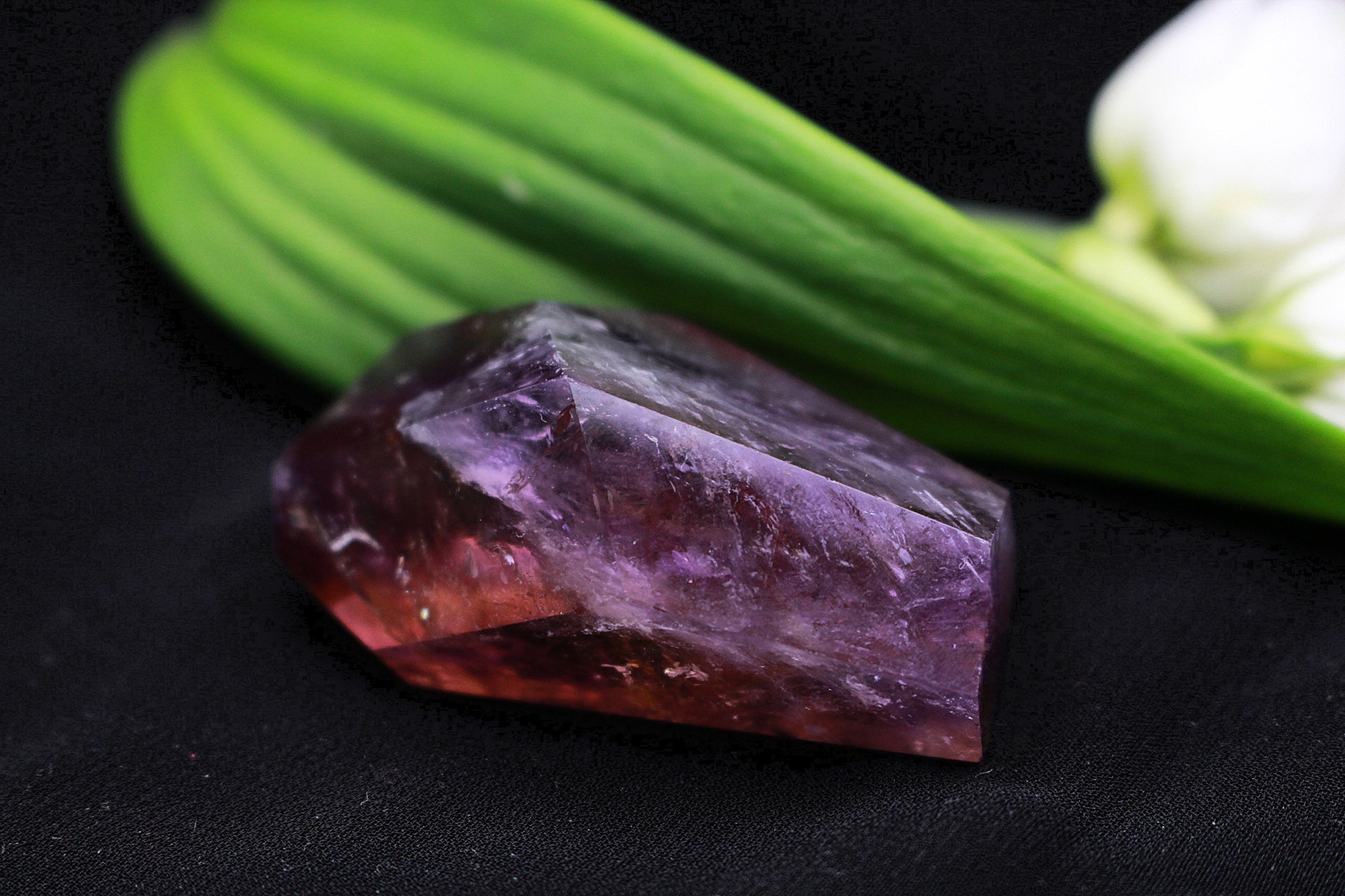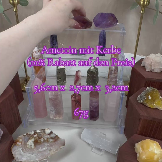 Ametrin ist eine natürliche Fusion von Amethyst und Citrin. Temperaturunterschiede beeinflussen die Oxidationsstufe und Anordnung der Eisenionen. Nur wenn während der Kristallbildung Temperaturunterschiede im Kristall auftreten, entstehen beide Farben gleichzeitig.