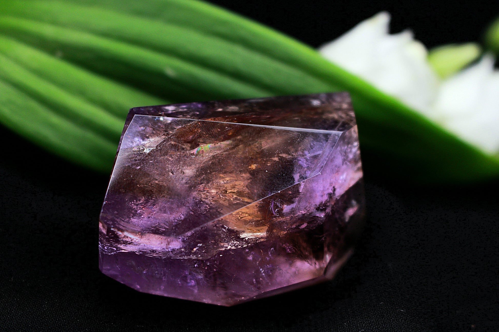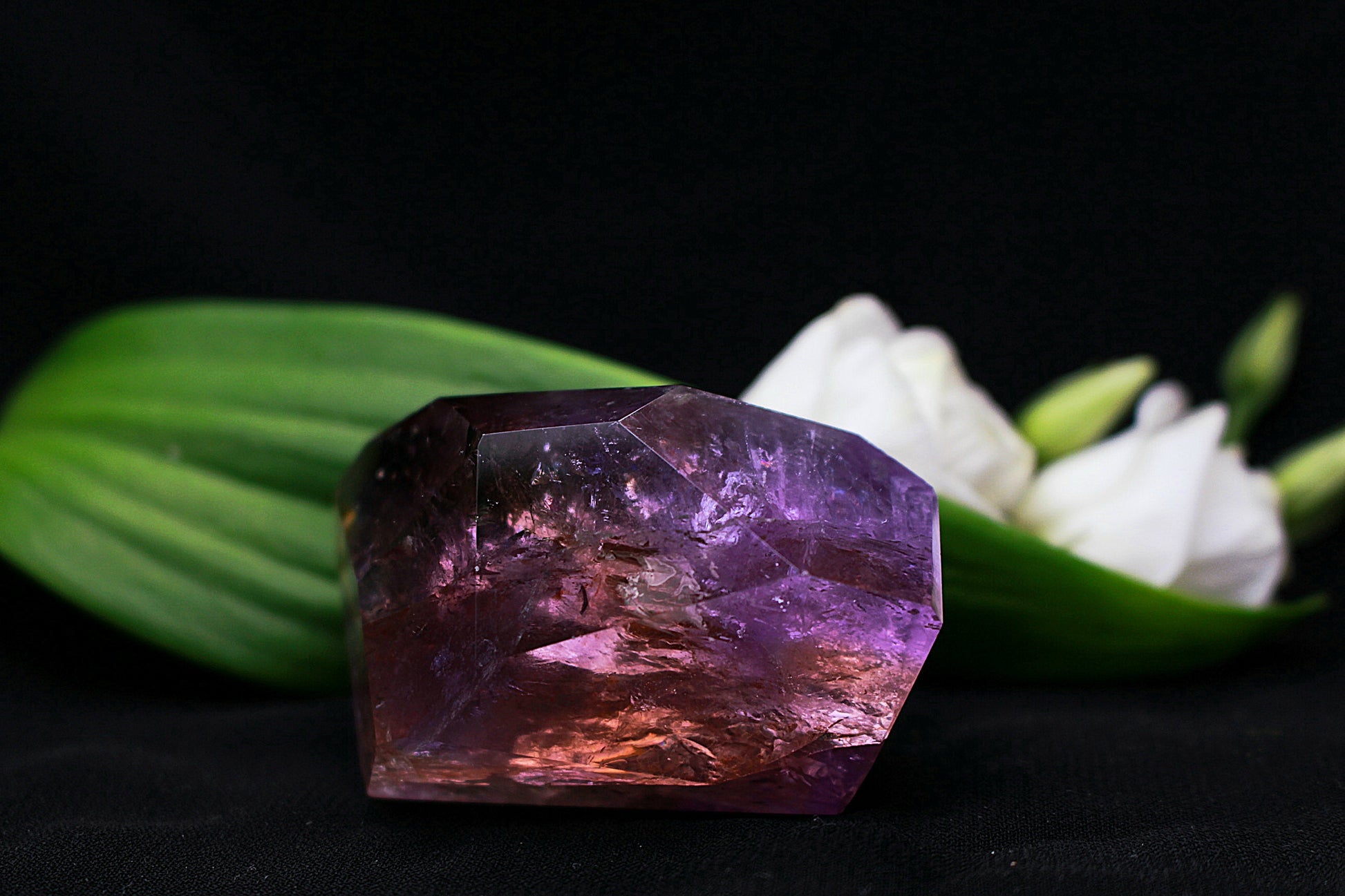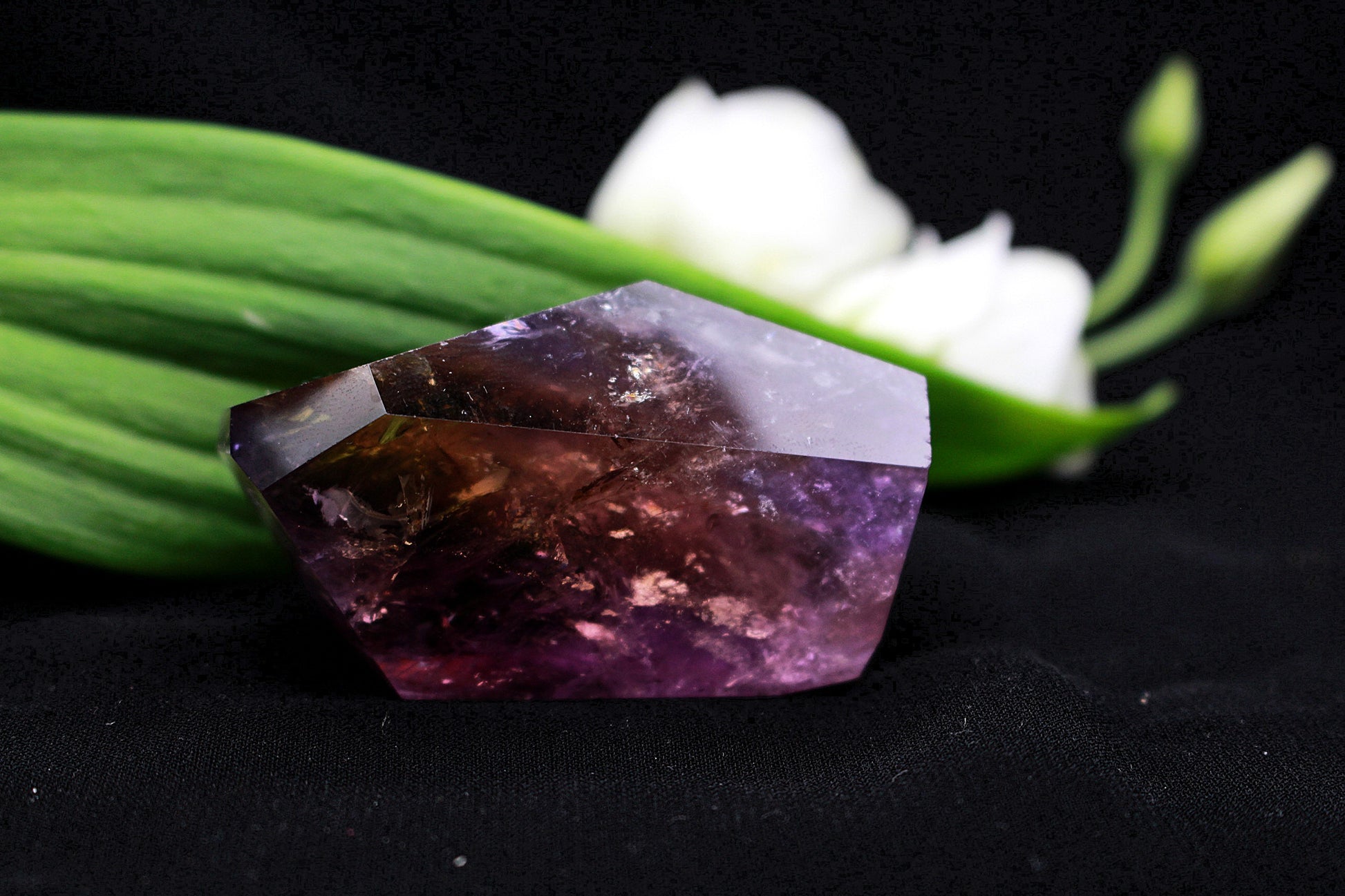 Ametrin ist eine natürliche Fusion von Amethyst und Citrin. Temperaturunterschiede beeinflussen die Oxidationsstufe und Anordnung der Eisenionen. Nur wenn während der Kristallbildung Temperaturunterschiede im Kristall auftreten, entstehen beide Farben gleichzeitig.