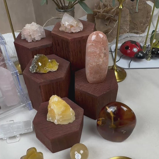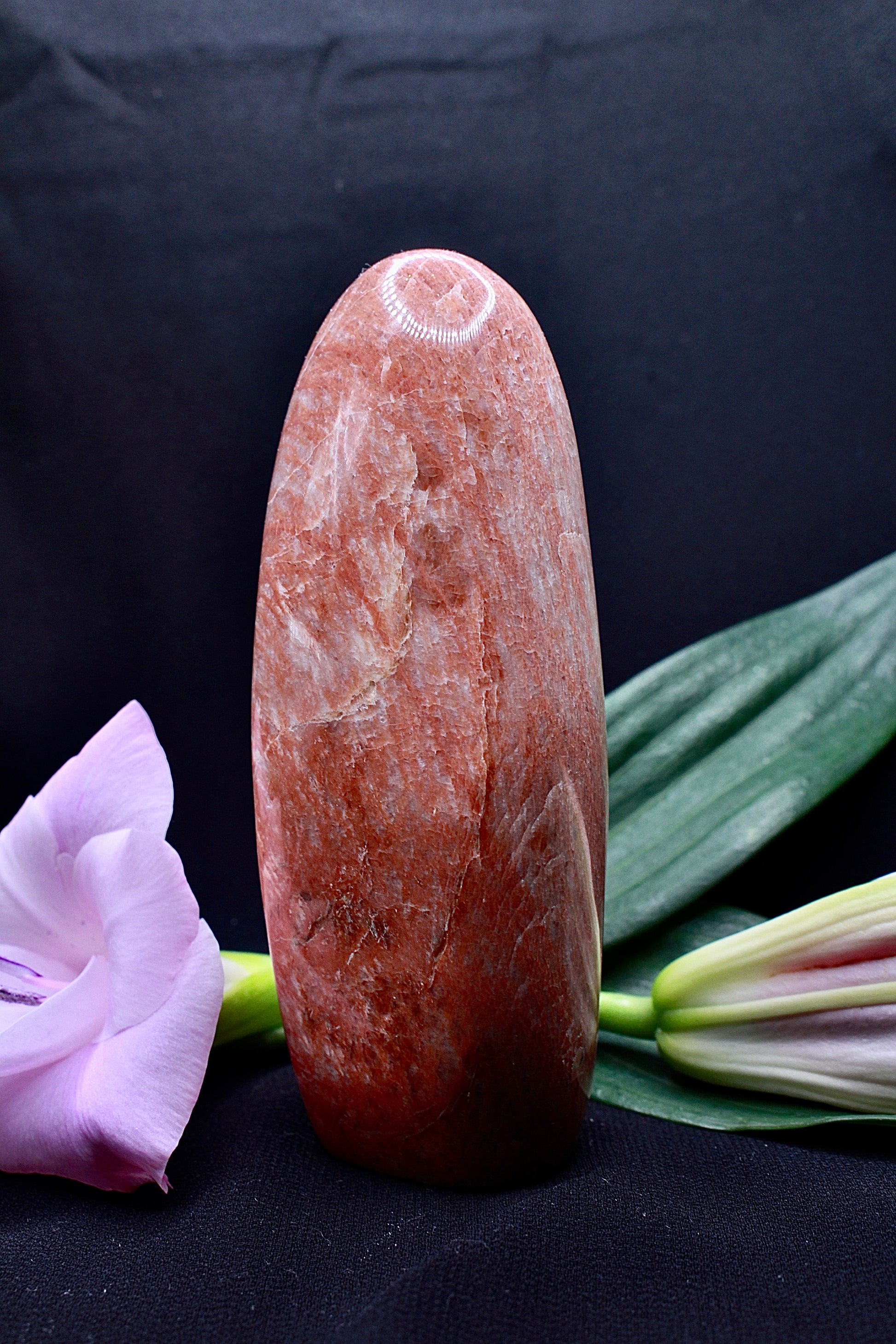 Aprikosenmondstein ist ein Kalium-Feldspat aus der Orthoklas–Adular-Reihe. Die aprikosenfarbene Tönung entsteht durch feine Einschlüsse von Hämatit oder Eisenoxid, die den Stein warm einfärben.