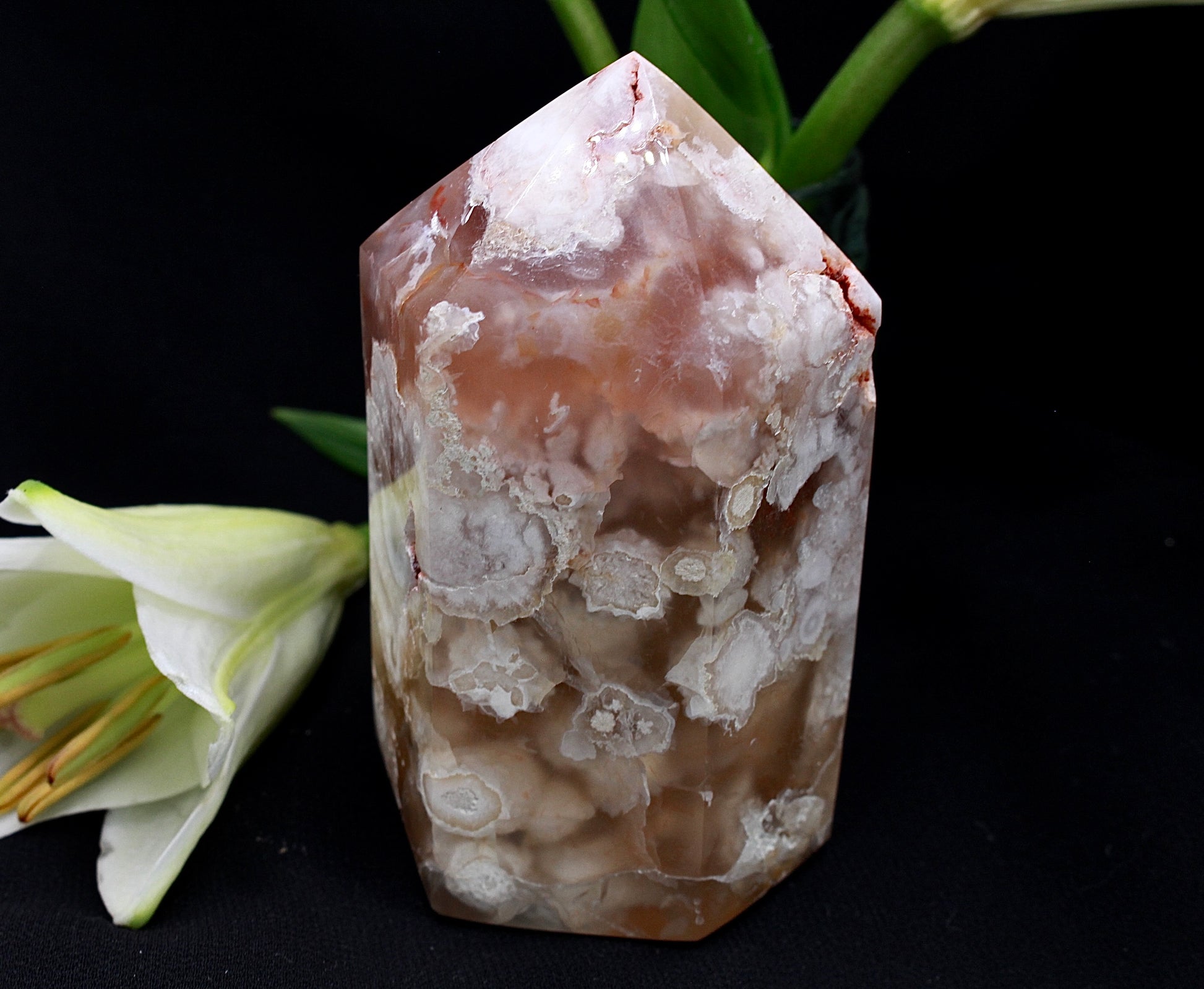 Die „Blumen“ entstehen durch Einschlüsse von Chalcedon, Opal oder Quarzknötchen, die sich kugelig entwickeln und beim Anschliff blütenartig erscheinen. Es handelt sich um eine Varietät von Chalcedon, also mikrokristalliner Quarz.