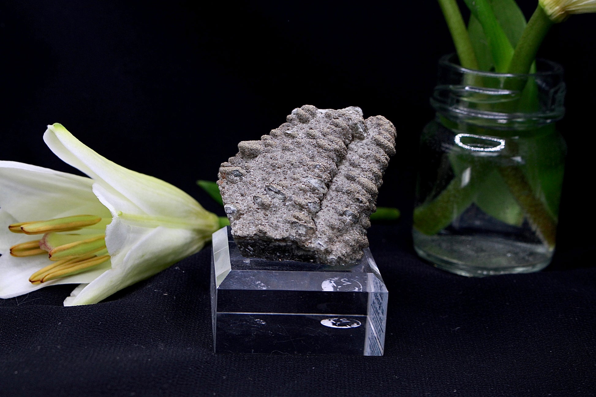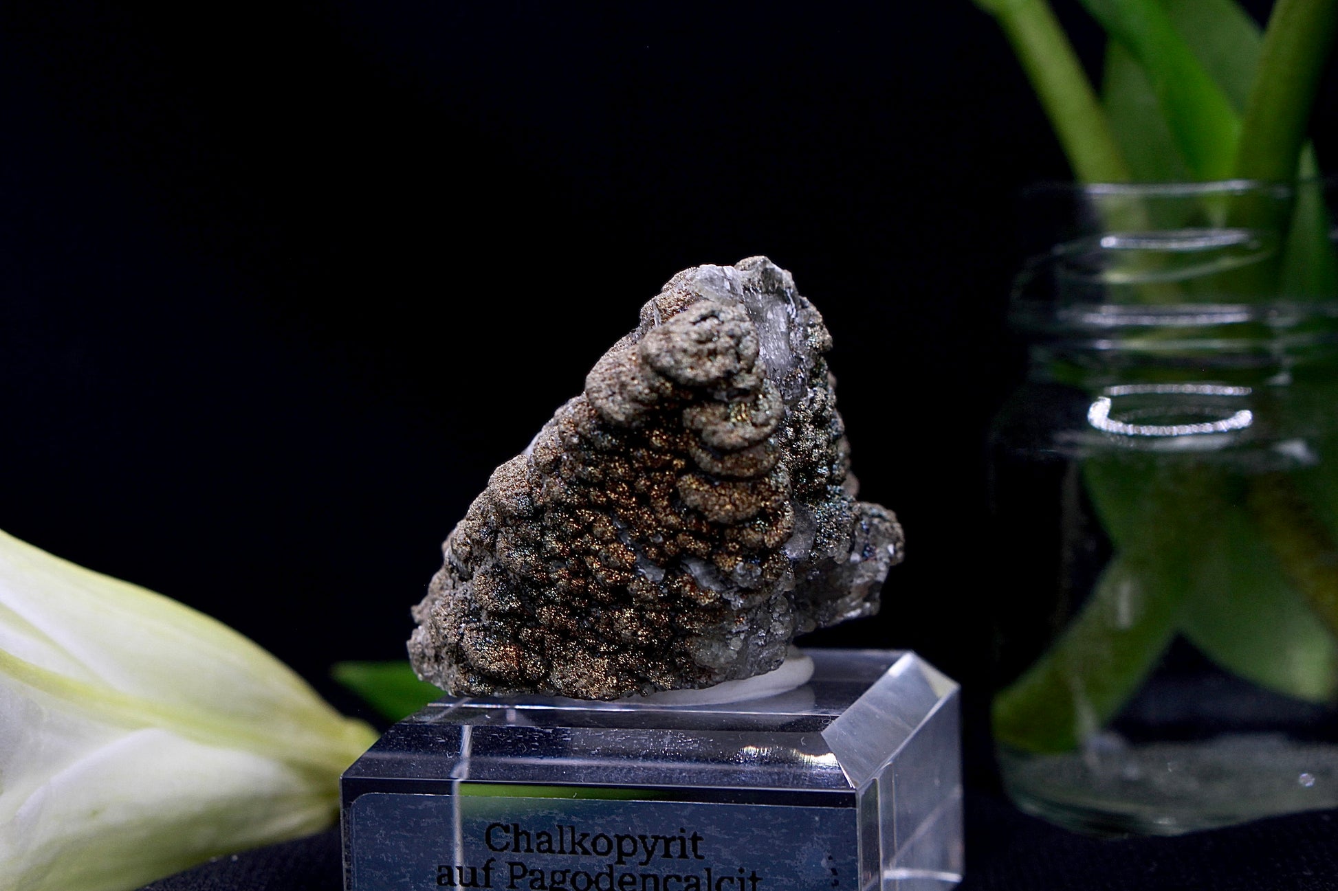 Zuerst wachsen die Calcit-Kristalle frei in einer Kluft oder Druse und nehmen dabei ihre typische, stufenförmige „Pagodenform“ an. Später durchströmen kupfer- und schwefelhaltige Lösungen die gleichen Hohlräume und lagern sich auf den Calcitflächen ab. Dort kristallisiert Chalkopyrit als goldgelb glänzende Kristalle. Das Zusammenspiel aus hellem Calcit und metallischem Glanz macht diese Kombination zu einem besonders dekorativen Sammlerstück.