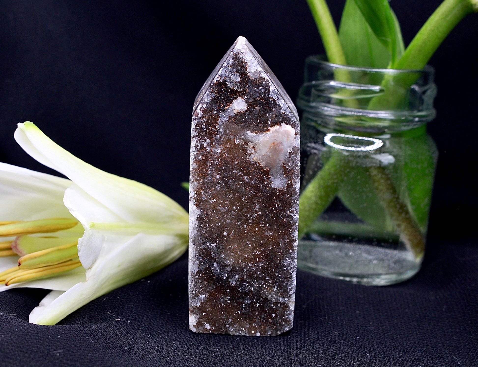 Quarzbildung entsteht durch mineralreiche Lösungen die in Hohlräume einsickern. Siliciumdioxid kristallisiert langsam aus und winzige Quarzkristalle setzen sich an die Wände. Dadurch entsteht ein „glitzerndes“ Kristallgefüge