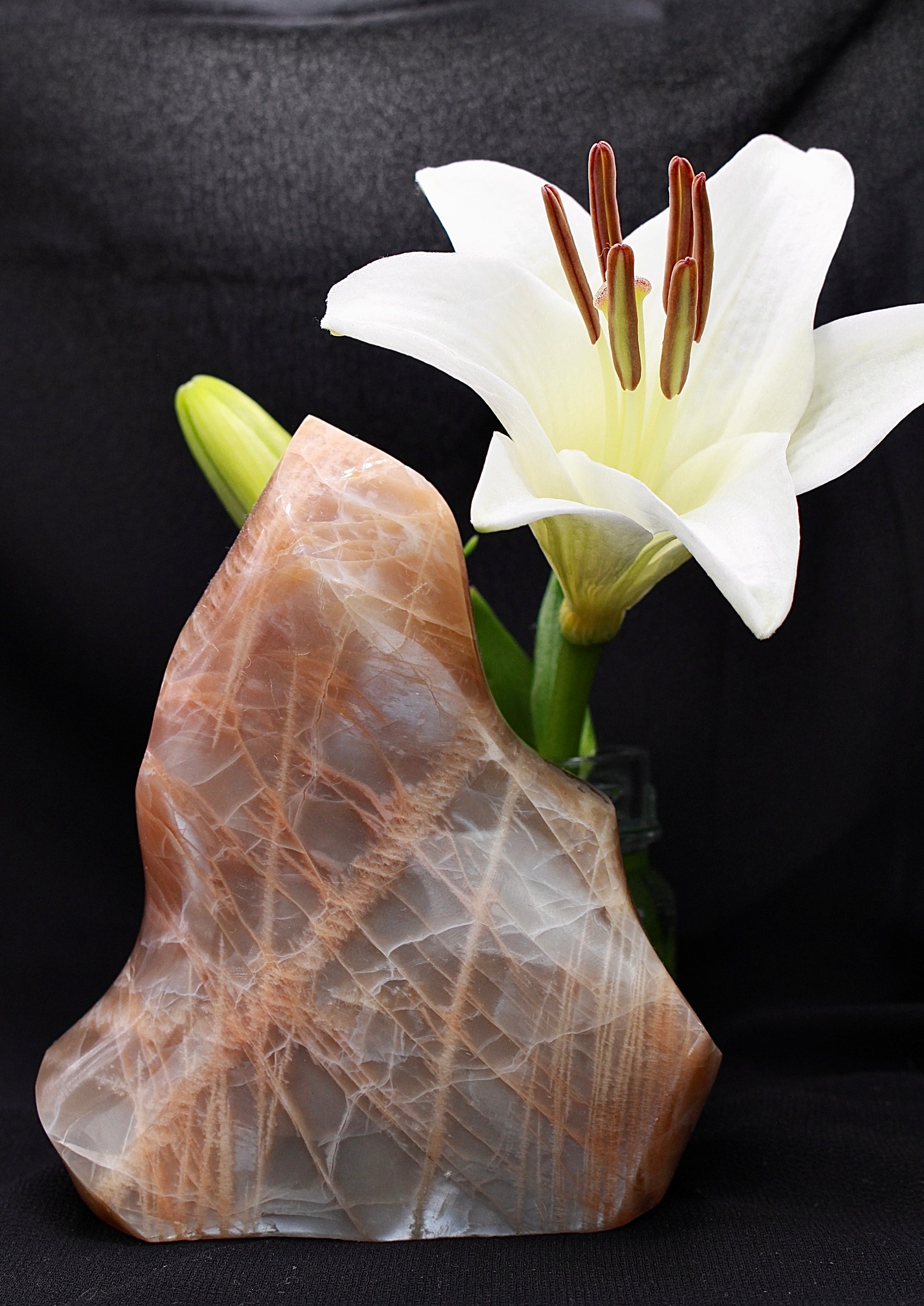 Mondstein gehört zur Gruppe des Feldspat genauer gesagt zu Orthoklas und Albit. Den seidig-blauen oder weißliche Schimmer, der über die Oberfläche “gleitet”, wenn man ihn bewegt, nennt man Adulareszenz. Dieser Effekt entsteht durch Lichtbrechung in feinen Schichten innerhalb des Kristalls.