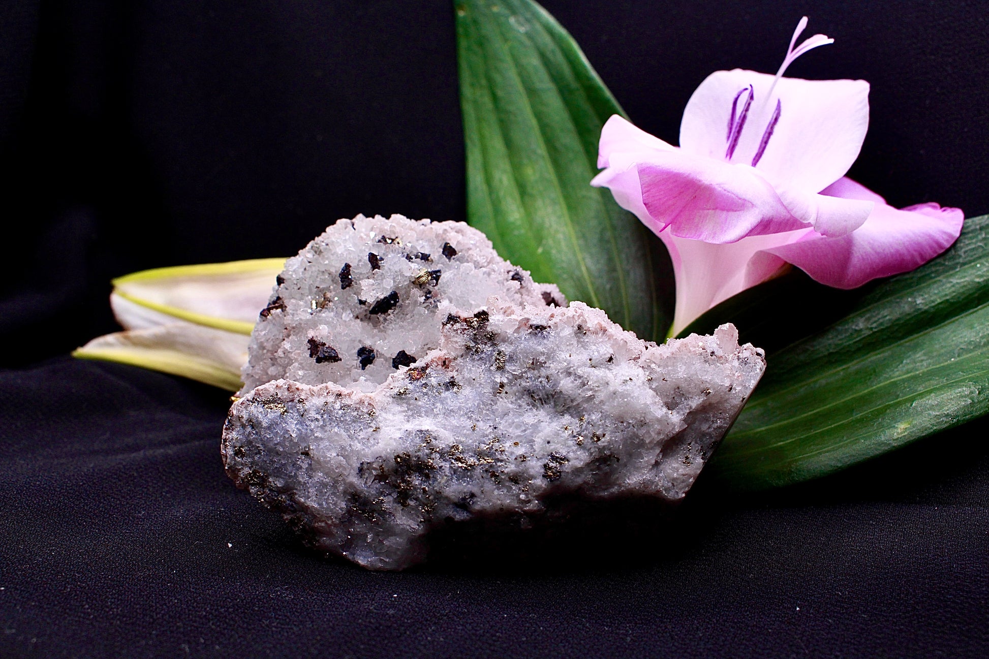 Quarz kristallisiert in Hohlräumen, später lagern sich Pyrit-Kristalle auf den Quarzflächen ab.