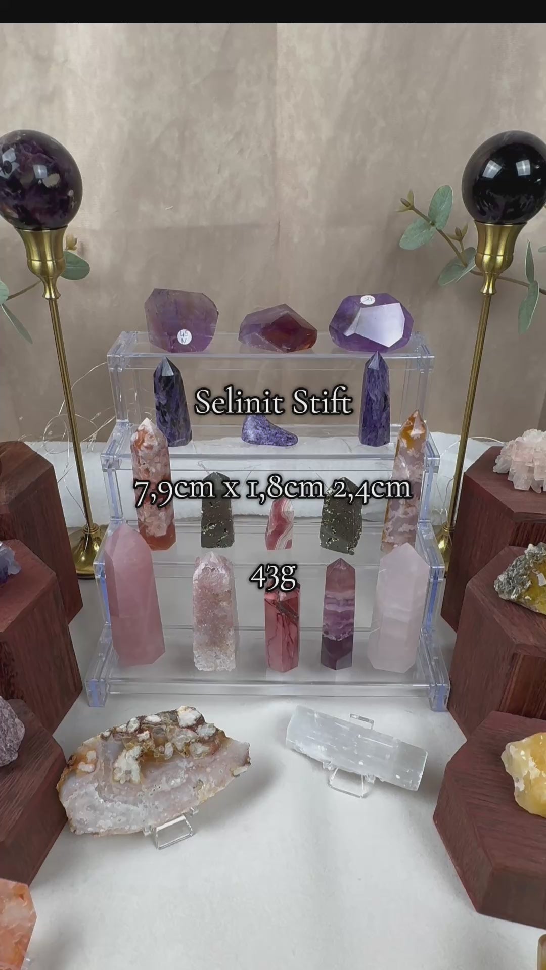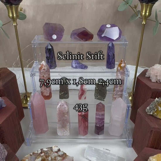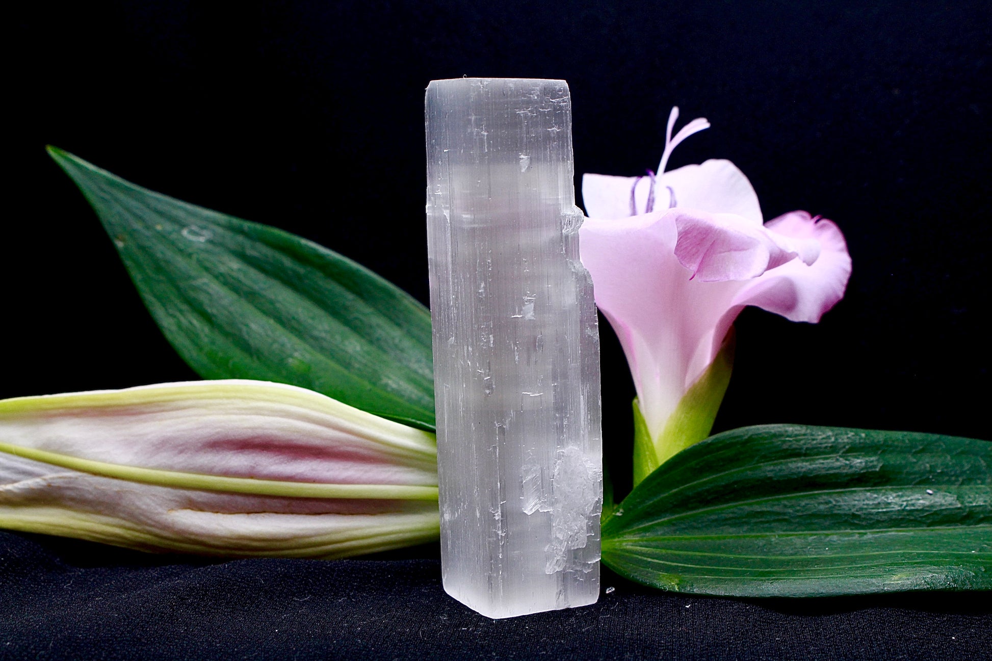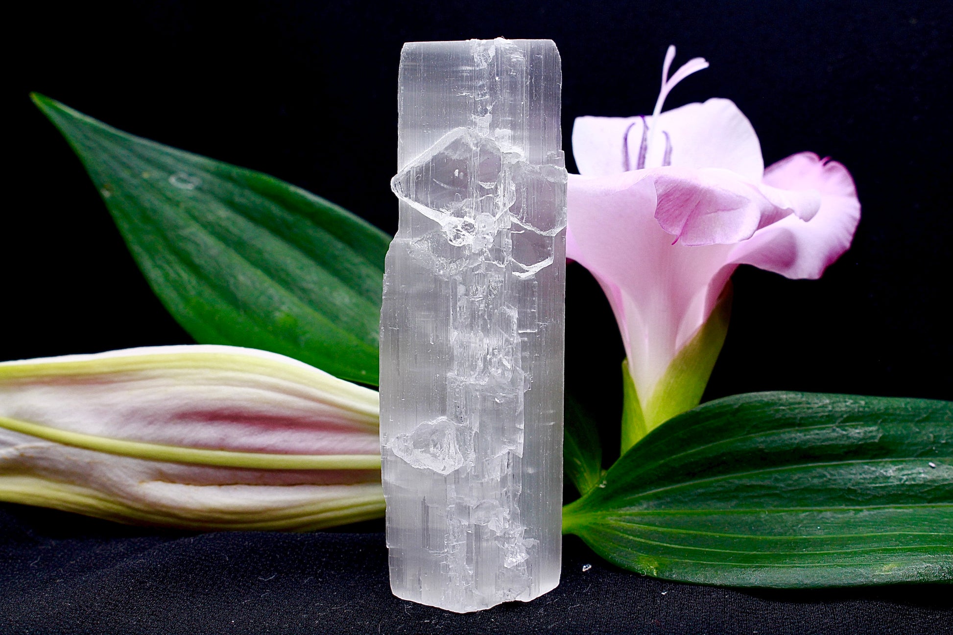 Selenit gehört zu der Mineralklasse der Sulfate und ist eine klare, kristalline Varietät des Gipses. Er ist sehr weich und empfindlich, man sollte ihn nicht ins Wasser legen, da er sich auflösen oder trüben kann.